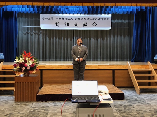 第2部の賀詞交歓会は各保険会社、日本代協理事、代協関係者、会員と多数ご参加いただき、来賓として保険会社代表で大同火災海上保険(株)取締役社長与儀達樹さま、日本代協北島理事よりご挨拶をいただきました。 3年ぶりの開催ともあって盛り上がり交歓会途中の景品抽選会もさらに盛り上りました。参加者の皆さんと楽しく有意義な時間を共有できました。 対面の大切さを改めて感じました。ご参加いただいた皆さんありがとうございました。